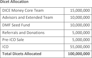 DICE Money terdiri dari 100.000.000 Diret dengan harga Ethers dan dialokasikan ke enam kelompok pemangku kepentingan.